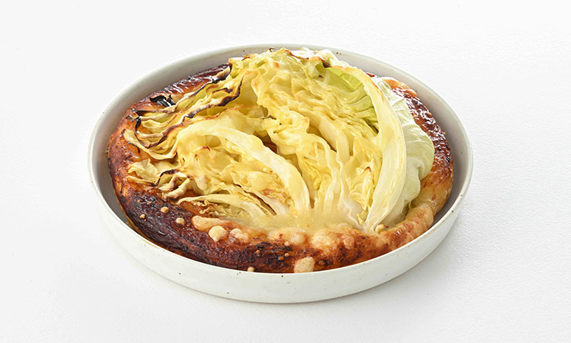 デニッシュ生地を使った春限定のピザ。アンチョビ入りのピザソースをベースに、キャベツのカットを大胆にのせて、バターとパルメザンチーズをのせて焼き上げました。