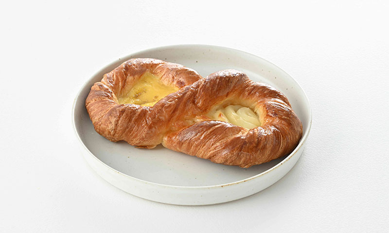 OTTE(デンマーク語で数字の8の意味)型のデニッシュに濃厚な味わいのホワイトチョコクリームとカスタードクリームの上にカルダモンパウダーでアクセントを加えた2種類のクリームを絞りました。
