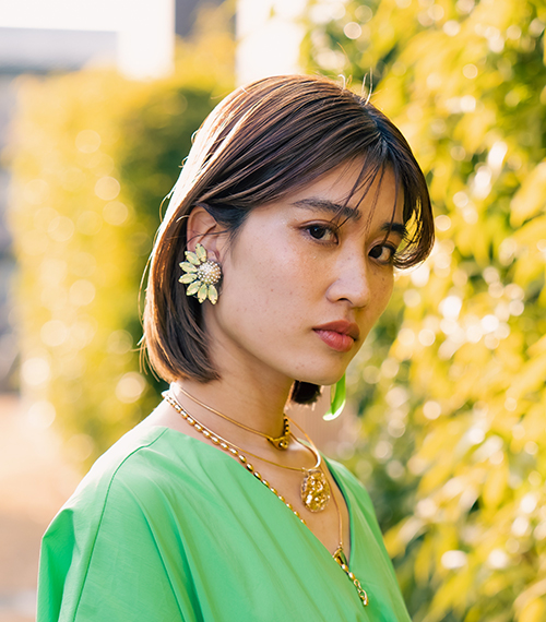 大胆かつ華やかなフラワーイヤリングは甘すぎず、シンプルなスタイリングを引き締めてくれます。