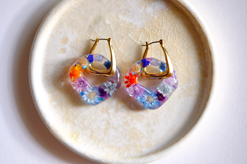 本物のお花と天然石を閉じ込めた着脱可能なリングパーツのアクセサリー。一点物で色味が綺麗なアクセサリーです。