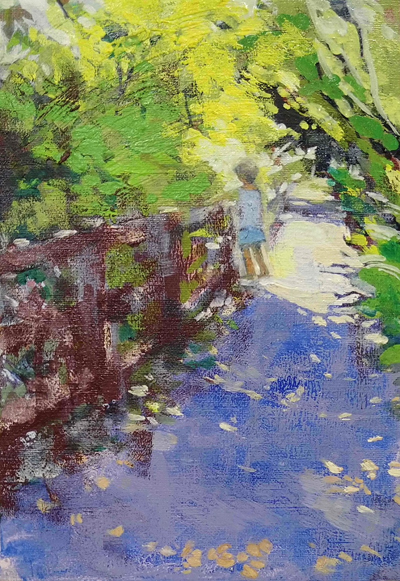 1959年広島県にお生まれになった広田稔先生は、東京藝術大学大学院を修了後、白日会を中心に作品発表を重ねられ、現在では白日会常任委員として後進の指導にも尽力されておられます。線描の美しい流れと鮮やかな色彩によって生み出された作品は、画面の奥に潜む音や聲、さらには温度や湿度、その場所の香りまで感じるような臨場感があります。