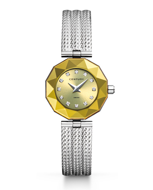 サファイアがきらりと輝き、文字盤のゴールドカラーと自然に溶け合います。