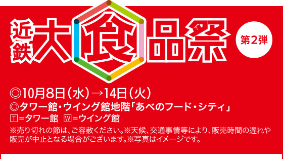 - 近鉄 大食品祭 第2弾[10月8日(水)→14日(火)/タワー館・ウイング館地階「あべのフード・シティ」]