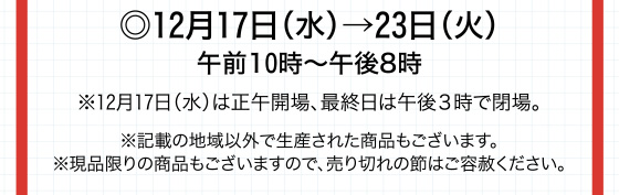 - ■12月23日(火)・24日(水): 地2階~2階 午前10時→午後8時30分