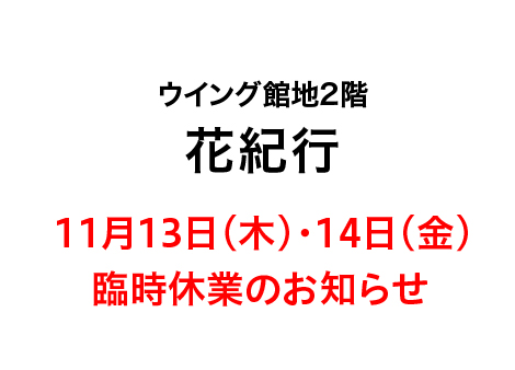 ◎ウイング館地2階「花紀行」 誠に勝手ながら11月13日(木)・14日(金)は臨時休業させていただきます。 お客さまにはご迷惑をおかけいたしますが、ご理解ご協力のほどよろしくお願いいたします。