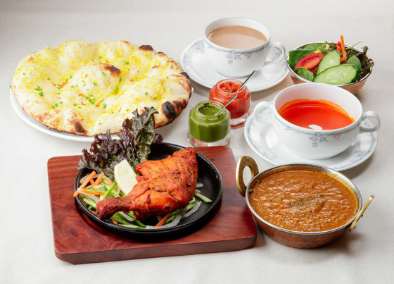 ジューシーな鶏もも肉タンドリーチキン、カレー、ナン、サラダにドリンク付きでお得なセットです。