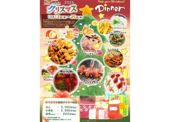・フライドチキン・チーズケーゼ・ビーフシチュー・スペアリブ・ブルスケッタ・ショートケーキ・かぶのカルパッチョ・フライドポテト・おからツリーサラダ・シュトーレンなど