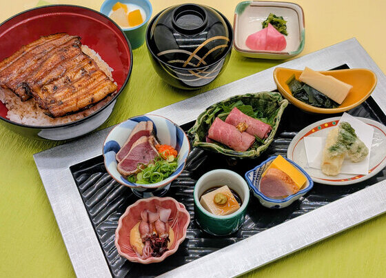 タワー館14階「大阪 竹葉亭」では、この時期の旬の食材を使用した一品と鰻を一緒に味わっていただける『雅御膳』をご用意しております。