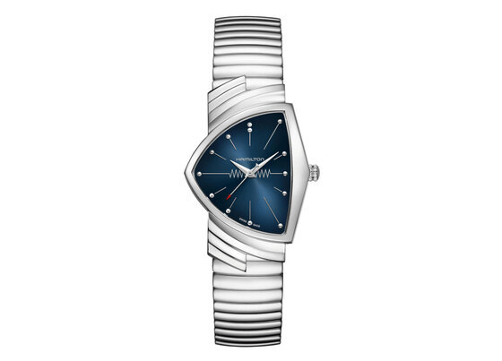 エルヴィス・プレスリーの大ヒットシングル『ブルー・スエード・シューズ』にインスパイアされた「ベンチュラ」は、ニッケルの時針、分針、秒針を備え、高い信頼性を誇るクォーツムーブメントを搭載しています。