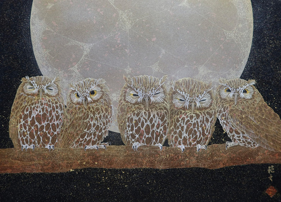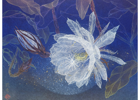 金箔・銀箔・金泥などの金属系の素材を用いて、動植物に意識を向けた作品づくりをしておられる金澤先生。シャープで繊細なマチエールで描かれる先生の作品は、それぞれのモチーフが静かな存在感を醸し出し観る人を画面の中の世界へと誘います。