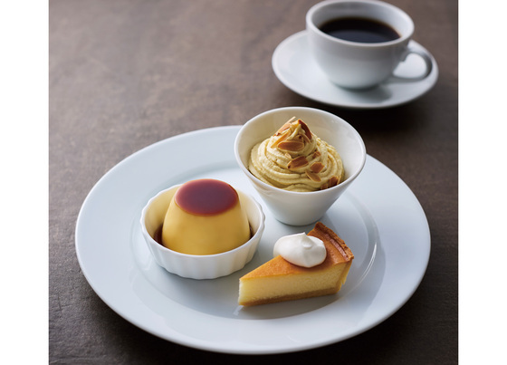 焼き芋クリームで仕立てたミニパフェ。カスタードプリン(ミニ)、デンマークチーズケーキをワンプレートで盛り合わせました♪