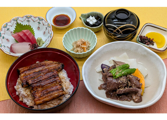 鰻丼・牛肉網焼き・造り・小鉢・香の物・吸物・デザートのセット