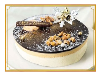 マスカルポーネとキャラメルのレアチーズを合わせ、表面はグラサージュで聖夜の夜空をイメージしました。