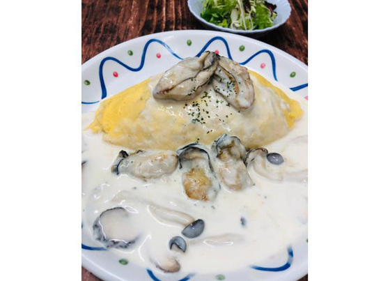 旬のカキがふんだんに入った自家製のキノコ入りホワイトソースのかかったスペシャルなオムライスです♪