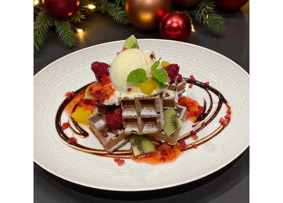 チョコレートソースが華やかなクリスマス気分を演出し、彩り豊かなフルーツは、一口ごとに幸せが広がる限定スイーツです!!