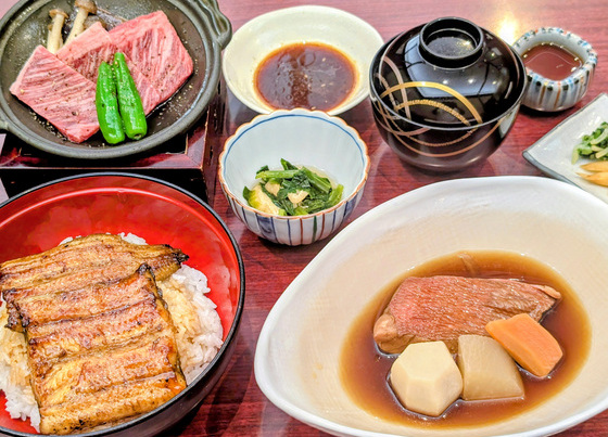 竹葉亭名物「鰻丼」、金目鯛煮付け、牛肉鉄板焼き、小鉢、吸物、香の物、デザートのセットです。